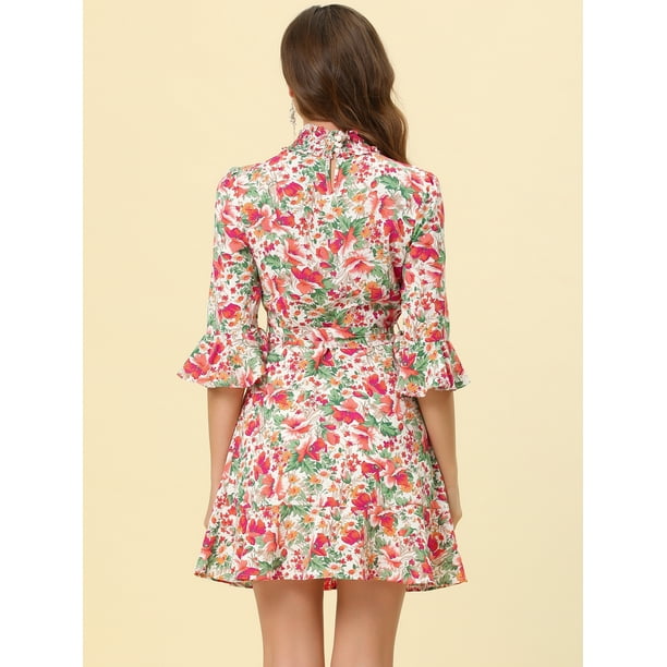 Allegra K Women S Floral 3 4 Bell Sleeve Belted Smocked Dress White Xl Walmart Ca